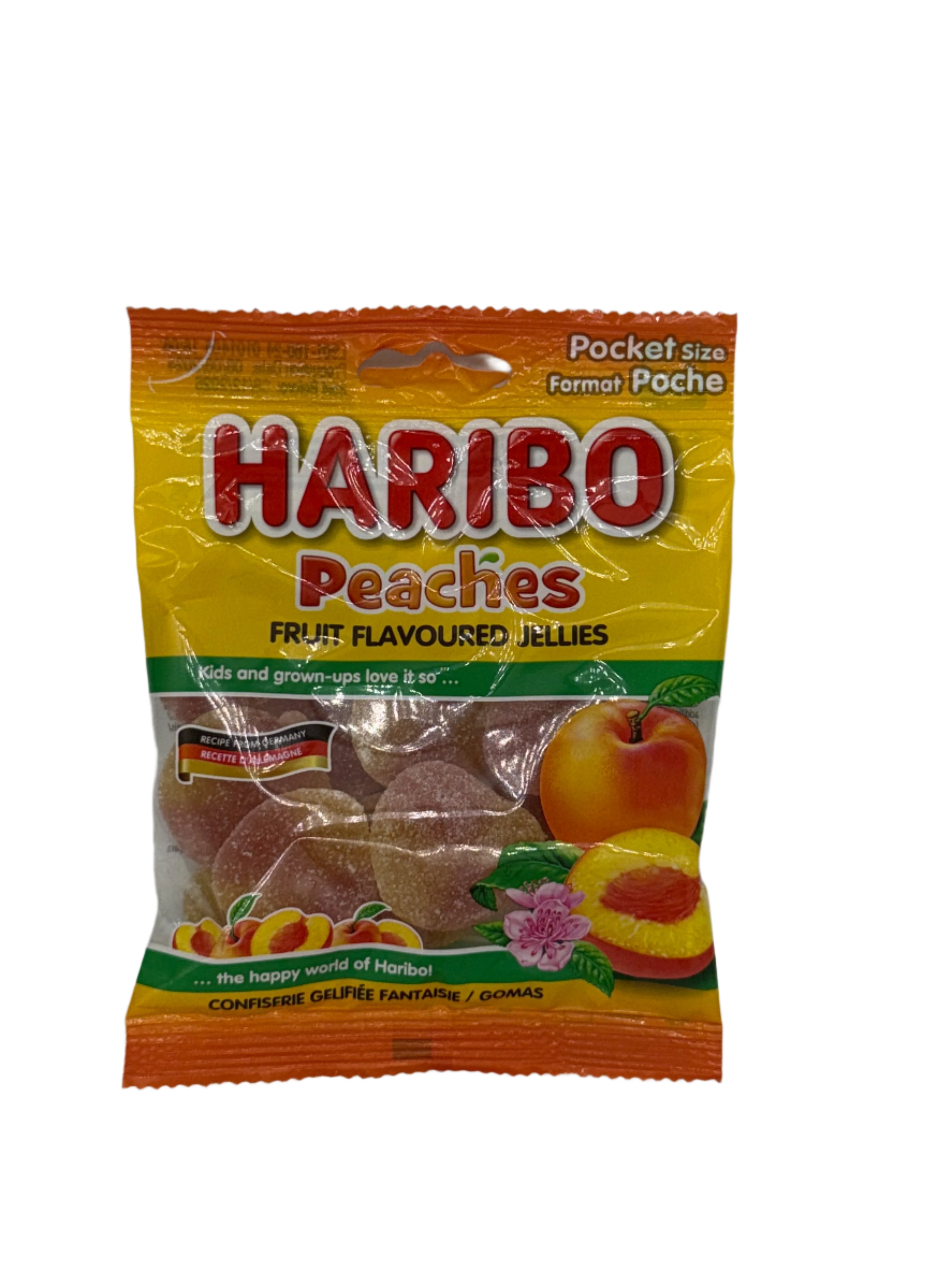 Fruit flavored, peach shaped Haribo jellies with a soft inside and crunchy sugared outside. Imported from Germany.