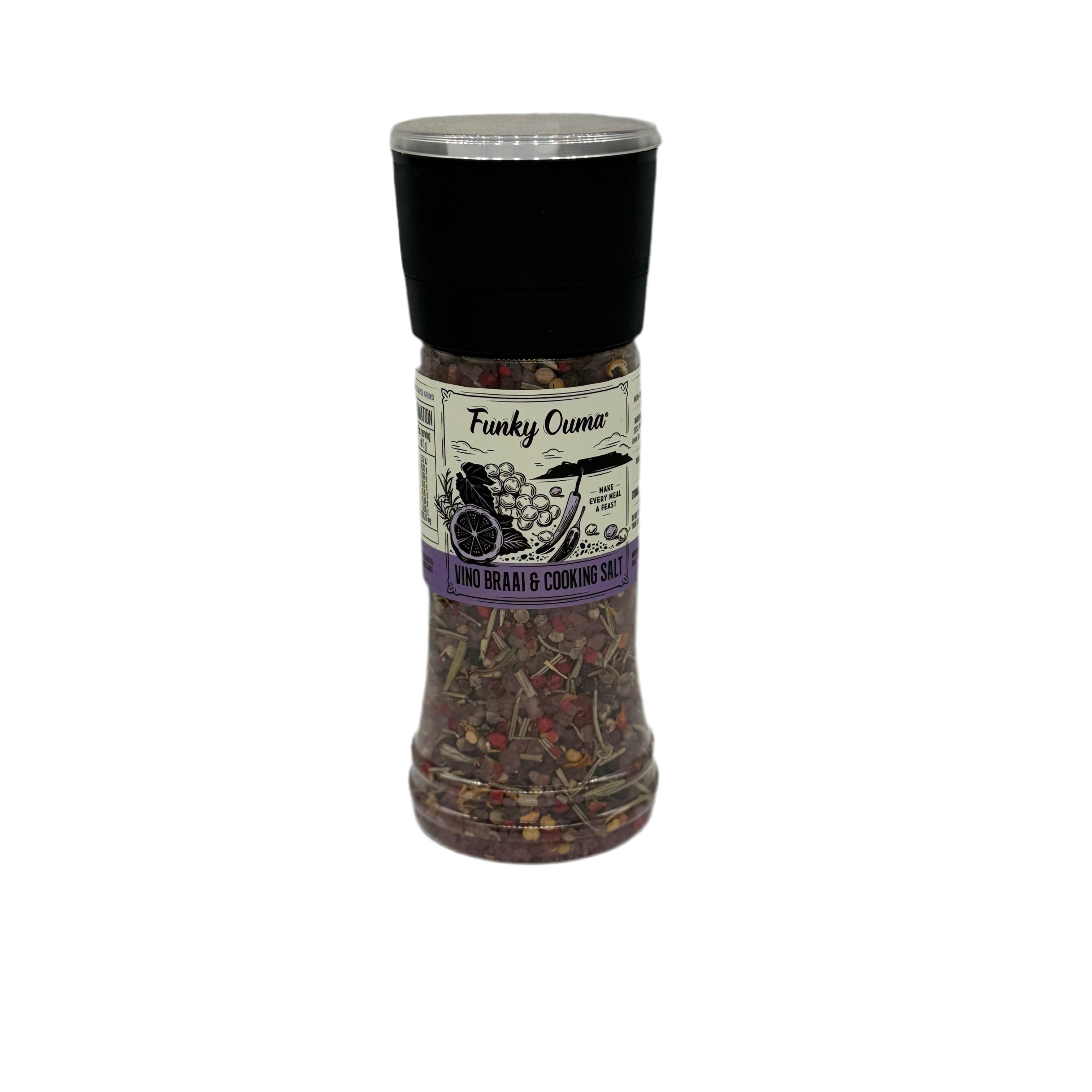 Our Vino Braai and Cooking Salt is made with pure Walvis Bay salt, infused with shiraz wine.